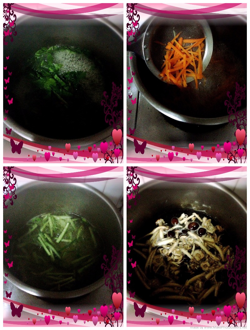 2.Put the spinach,carrots,cucumber and Hong Xi mushroom in the boiling water, then drain and press out excess water.